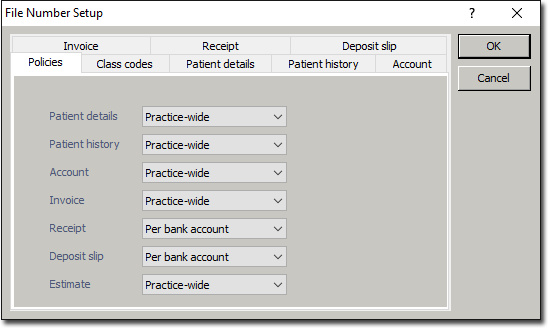 Select Setup > Practice > File Numbers. The File Number Setup window appears.