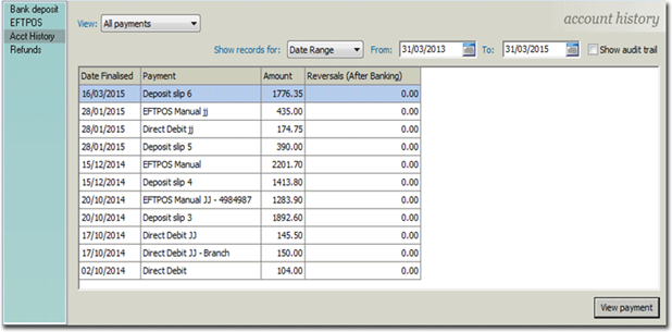 The Account History menu allows a user to view all payment types made by the account holder. Payments include the past finalised deposits and settlements within the account.
