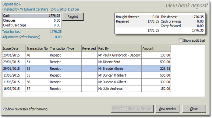 The window appears with a list of all transactions included in the deposit or settlement. If you tick the Show Reversals After Banking check box, any receipts reversed after banking within the specific date range will also be displayed.
