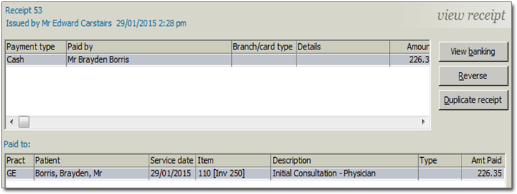 To open/view a Receipt; highlight the required receipt and either double-click or click on button. The window appears with receipt details.