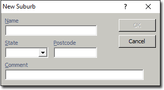 If you discover that Bluechip does not have a record of a new suburb, you can add it manually, by following the instructions following. Note also that you can import lists of post codes distributed by Australia Post.