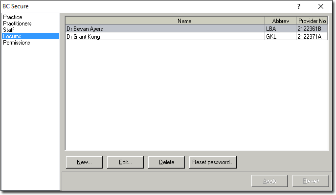 | Delete | Removes the ability to use the Locum in billing, along with any permissions previously assigned. Deletion of the Locum's details is immediate with no confirmation message. There is no need to click apply, and the revert button does not retrieve a deletion in error. |