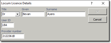 The Locum window is used to add Locums practising on behalf of a regular practitioner. Before beginning, ensure the Locum's provider number is supplied.