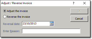Select whether to adjust or reverse the invoice. Adjust is selected by default. If you do not have permission to reverse invoices, the reverse option will be inactive. If you choose to reverse the invoice, indicate also the date on which the reversal took place. The default is the current date. -