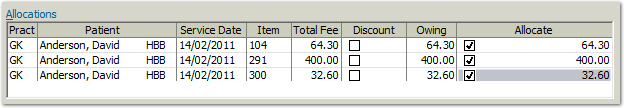 - Allocate the amount that is being paid to the current practitioner's account by selecting the appropriate check boxes in the Allocate column, as shown below.