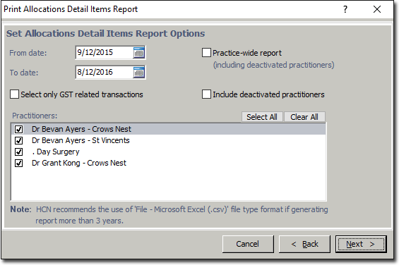 - Reports based on the 'practice wide' option display a detailed item-based listing of receipts allocated and credit allocated to invoice transactions for the practice, and class-based and practice-based transaction totals for all practitioners (including deactivated).