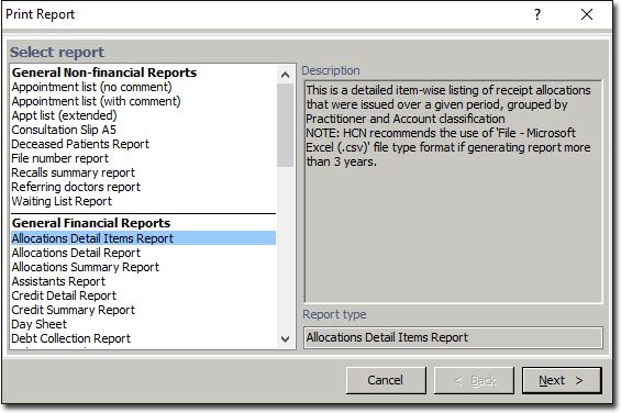 - Reports based on the 'practitioner wide' option display a detailed item-based listing of receipts allocated and credits allocated to invoice transactions for each practitioner, and class-based and practitioner-based transaction totals for each practitioner. Additionally this report displays class-based summary totals for all selected practitioners.
