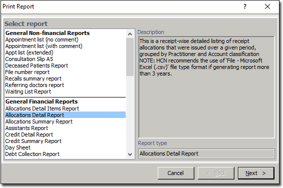 This is a receipt-wise detailed listing of receipt allocations that were issued over a given period, grouped by Practitioner and Account Classification.