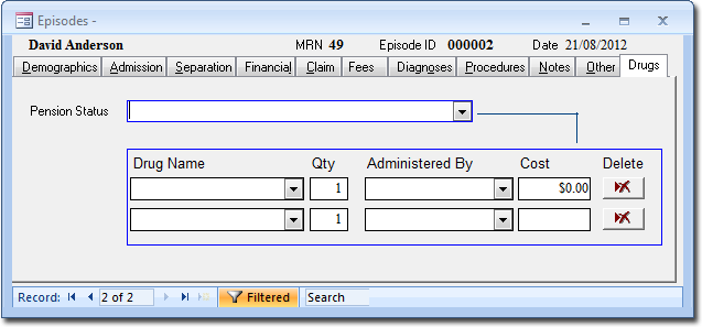 The Drugs tab is used in WA, VIC and SA. Although the screen elements remain consistent throughout, the placement of the tab in the episode may differ between the states.
