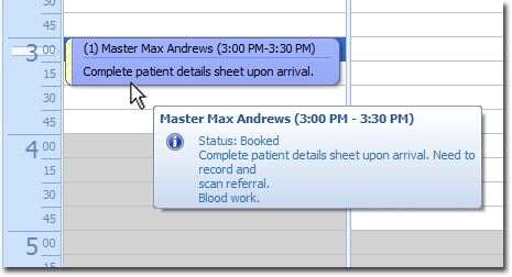 Notice in the example below that an appointment's comments are visible from the Appointment Book, but in order to conserve space, the number of displayed characters is minimised. To view the entire comment text, roll your mouse pointer over the appointment.