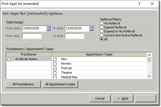 This report provides you with a list, in order of scheduled time of arrival, of all patients who have appointments booked on the dates you select, with the Practitioner you select, and of the appointment type you select.