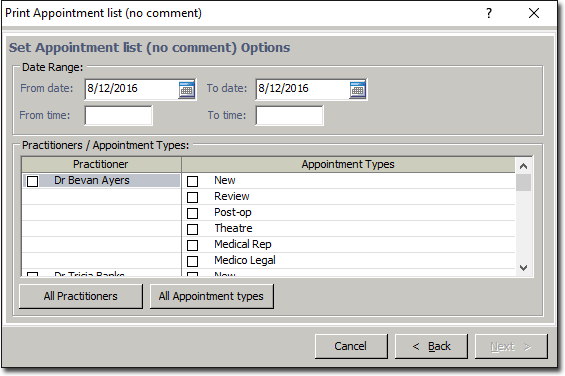 This report provides you with a list, in order of scheduled time of arrival, of all patients who have appointments booked on the dates you select, with the Practitioners you select, and of the appointment types you select.