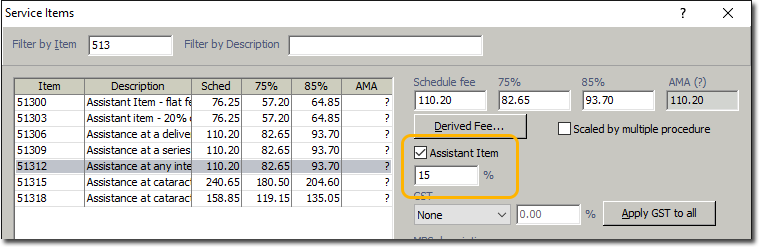 For each item you want to associate with assistant billing, tick the Assistant Item check box, and enter the require percentage in the % field.