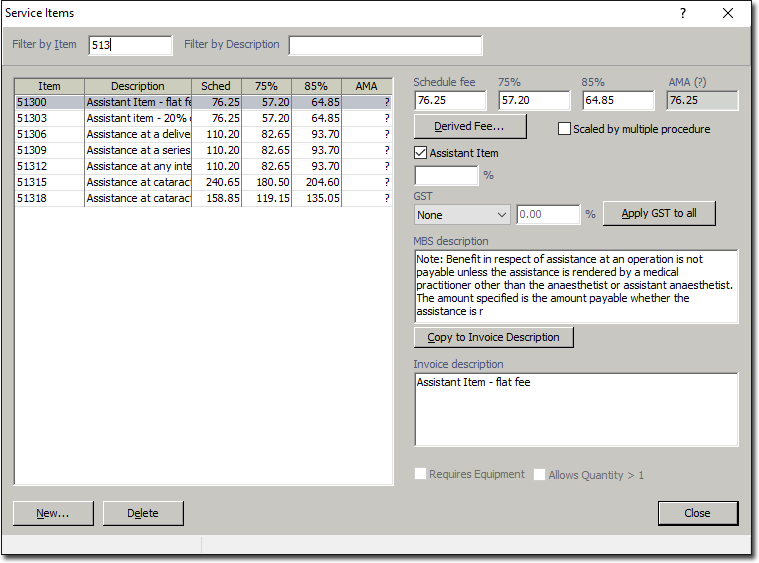 You must specify which Service Items qualify as 'Assistant Items' for the purposes of billing. Once enabled, if you add these items to an invoice, the associated percentage fee will be calculated automatically for you. If a Health Fund Assistant Percentage differs from the usual 20%, you are required to amend the percentage amount to include the additional percentage in each Health Fund Fee List.