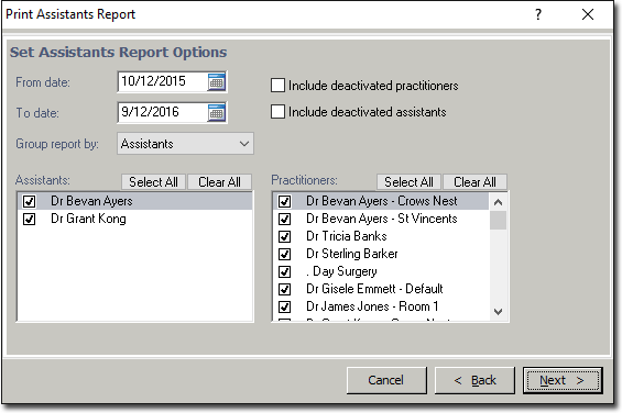 - If you chose Specific for both Assistants and Practitioners, you will be able to choose between grouping the reports by Assistant or Practitioner. Make this selection from the Group reports by: drop-down menu. (Note that choosing Specific for either Assistants or Practitioners will cause a separate report to be generated for each nominated assistant and Practitioner.)