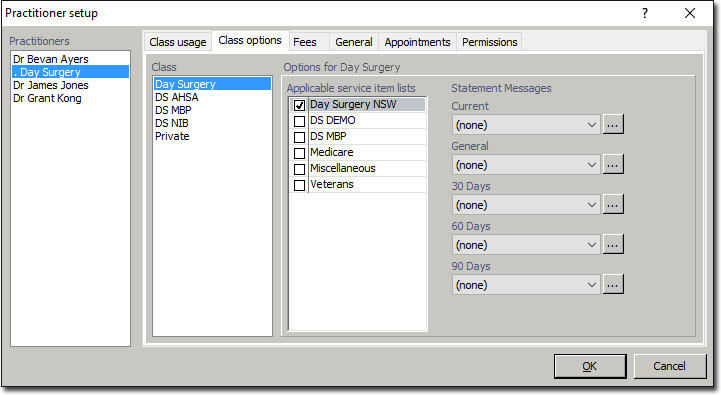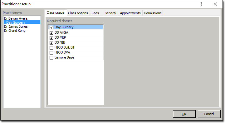 Within Bluechip select . The window appears. Indicate that the Day Surgery class you created is a Required Class by ticking the associated check box, as shown below.