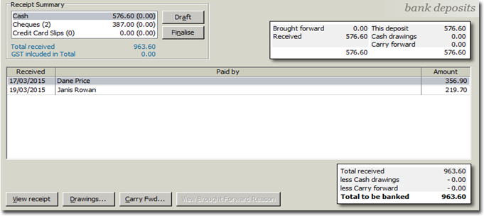 - Carry Fwd: Allows you to allocate an amount not to be included in the deposit. This amount will be available to be included in a future deposit. For example, when reconciling direct debits with a bank statement and settling receipts with actual deposit dates.