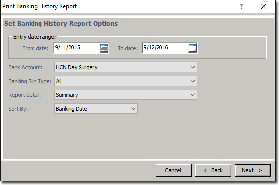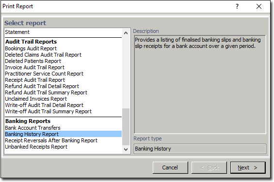 - Banking History Summary Report - a summary list of finalised banking slips (without receipt transactions) for a selected bank account over a specified period.