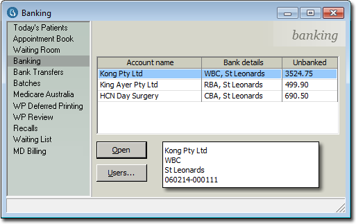The Banking window contains a list of all bank accounts that exist in the system, and into which receipts are entered. Once a bank account is opened, you are able to finalise Bank Deposit Slips, and settle EFTPOS and Direct Debit payments.