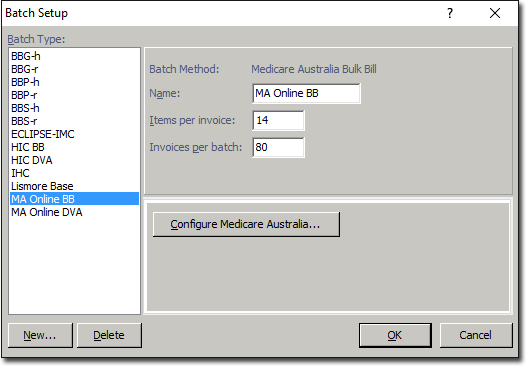 For batch types using either the Medicare Online Bulk Bill or Medicare Online DVA Streamlined method, the Configure Medicare Australia button is enabled. This button allows you to setup your Medicare Online settings.