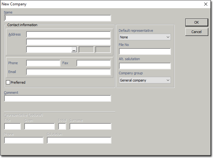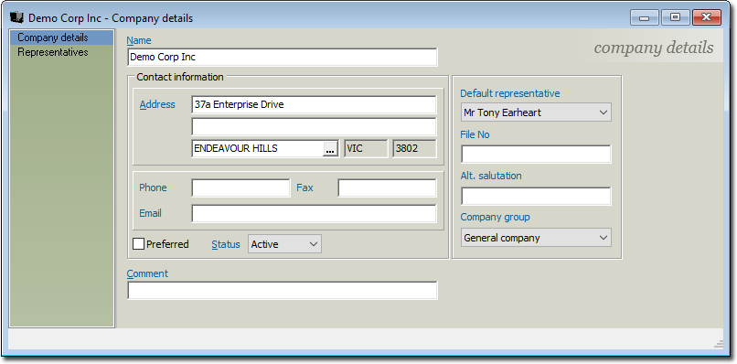 Company Details window. From here you can also manage the Company's Representatives.