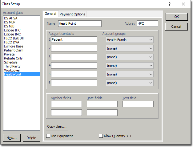 Configure a Class for HealthPoint Online Claiming Before you begin First, ensure you have configured a Batch Type for HealthPoint Online Claiming Procedure Select Setup > Practice > Classes from the Bluechip Main window. The Class Setup window appears. Click New. The Copy window appears. Enter the following settings; Copy from class: (none) Name: HealthPoint Abbreviation: HP or HPC Click OK. ResultsThe class is added to the list of account classes. What to do nextContinue to Configure a Class to use a HealthPoint Online Claiming Batch Type.