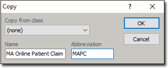 Configure a Class for Medicare Online Patient Claims Before you begin Ensure you have configured a Batch Type for Medicare Online Patient Claims. Procedure Select Setup > Practice > Classes from the Bluechip Main window The Class Setup window appears. Click New The Copy window appears. Enter the following settings; Copy from class: (none) Name: MA Online Patient Claim Abbreviation: MAPC Click The class is added to the list of account classes. What to do nextContinue to Configure a Class to use a Patient Claim Batch Type.