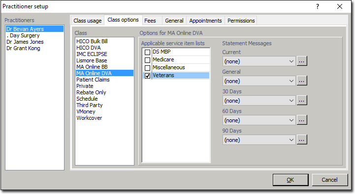 - Within the Applicable Service Item Lists list, tick the Veterans option (classes established using a Medicare Online DVA batch method can only be associated with the Veterans service item list).