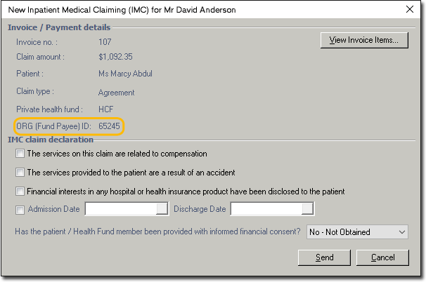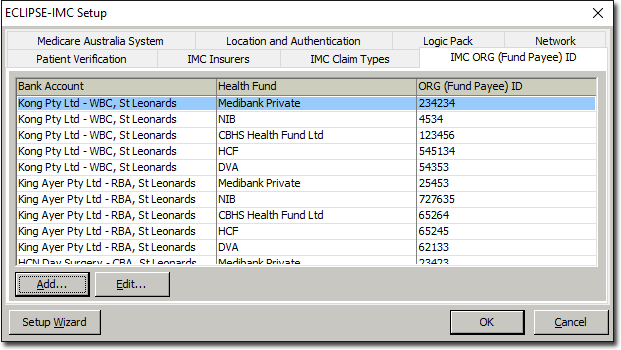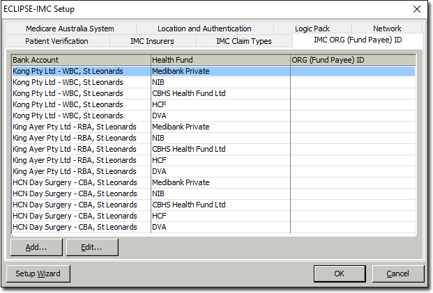 (Optional) Select the IMC ORG (Fund Payee) ID tab. Some Health Funds may issue you a different ORG ID for each bank account you use. You can record these IDs via this tab.