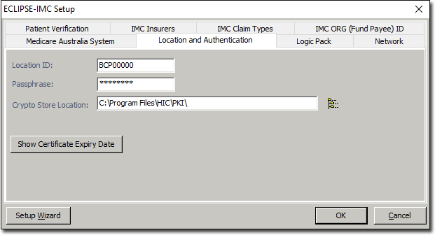 It is at this time you must enter the Location ID, Passphrase and Crypto Store Location for your encryption certificate. This information will be supplied to you by Medicare. It may be that you already have this information recorded if you have already configured Bluechip for Medicare Online claiming. -