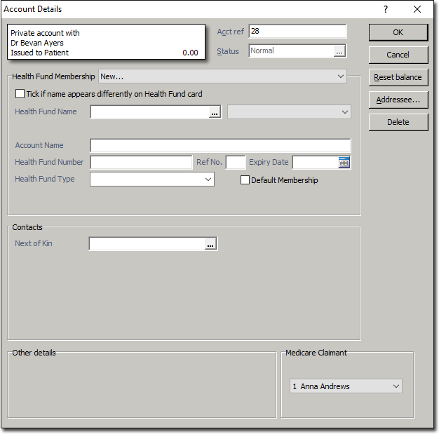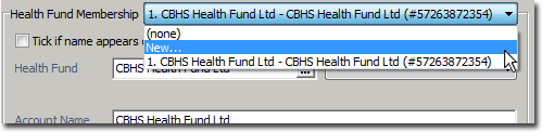 Via the Health Fund Membership drop-down list, select the Health Fund you want to associate with this account. If the health fund you want to use does not appear here, you can create it now, by selecting New... from the menu.