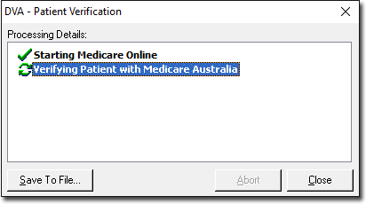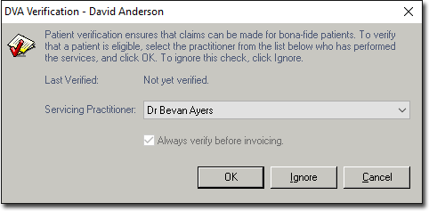 You may be prompted to initiate a patient verification for the patient. The DVA Verification window appears if one of the following conditions is met;- The Always option is selected on the Patient Verification Tab of the MA Online DVA batch settings, or