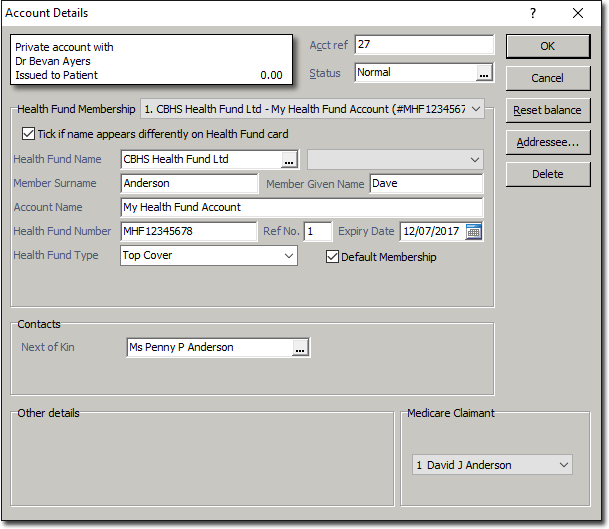 For more information about this window see Account Details Window Overview. - Enter details as necessary. Click OK to save and to close the Account Details window.