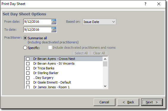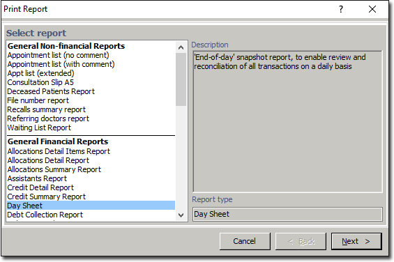 The report can perform a dual role, it can be used as a financial report, for keeping track of each day's turnover and keeping track of adjustments, and as a copy of practice records. A practice that has printed Day Sheets every night will have them as a record of what has been entered into the system since the last restorable backup.