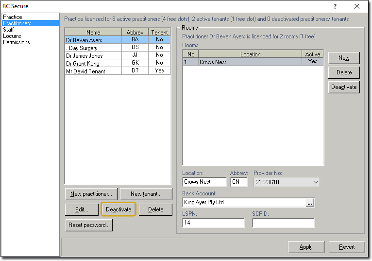 button (highlighted above) is a toggle that deactivates/reactivates selected practitioners. Throughout Bluechip, where an inactive practitioner appears, they are clearly identified in italics, and either (D) or (Deactivated) will be appended to their name.