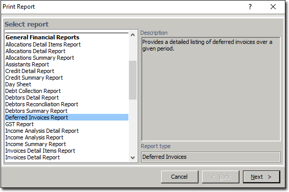 This report is used to keep track of any deferred invoices. An invoice that has been deferred has not been issued and has not, therefore, incurred a debt in the patient's account. Because of this, these invoices will not register in any of the normal financial reports, such as Earnings, Reconciliation, Debtors reports, and so forth.