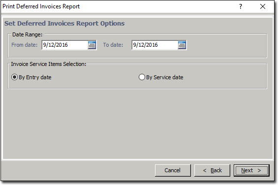 Deferred invoices are only included in this report if they were entered or modified, and deferred, within the specified date range. This means that the Deferred Invoices Report is based on Date of entry. The dates of service of the items included in the invoices have no bearing on the report.