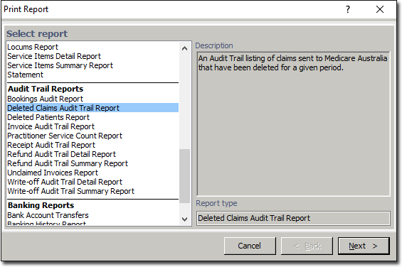 Select one of the Deleted Claims Audit Trail Report from the list provided (you may have to scroll down the list to access it), and click Next The criteria window for the selected report will appear.