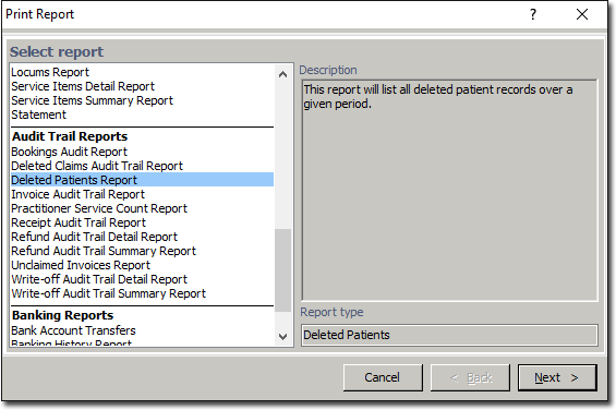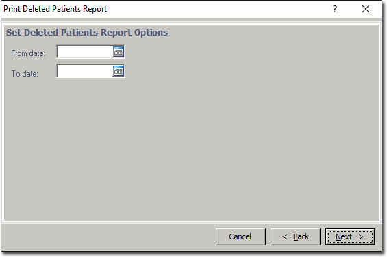 Deleted Patients Report Lists all deleted patient records over a given period. Before you begin Procedure Either Click Press Ctrl + P Select Reports > Print The Print Report window appears. Select Deleted Patients Report from the list of reports and click Next The Print Deleted Patients Report window appears. Enter the date range for the report. Ensure that the correct printer and tray is selected and then click Next Results