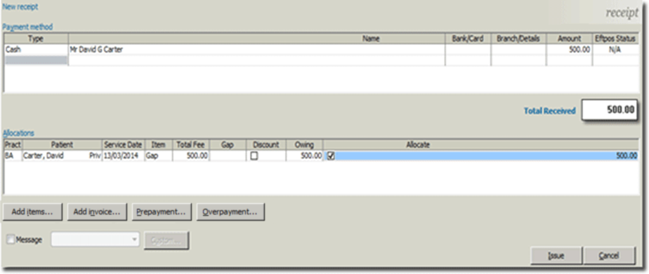 The New Receipt window appears. Select a payment Type from the drop down menu, enter the amount, and allocate the invoice amount to the receipt amount by clicking the open box (right of amount). This will display a tick, click Issue, click OK to date; select receipt and File or Print.