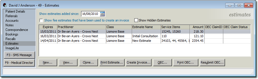 Open the patient's record, and select the Estimates entry in the menu.