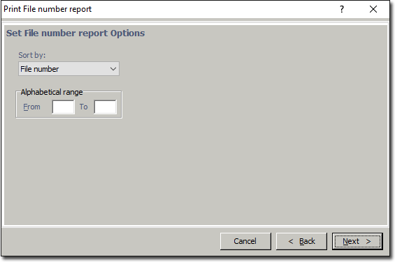 You may choose to base the report on File Number, in which case the report is printed in File Number order. It is important to note that File Number is an alpha-numeric field, rather than a number field. This means that a report printed in File Number order will be generated in alphanumeric order. For example, numbers 1 - 20 would appear in the following order: 1,10,11,12,13,14,15,16,17,18,19,2,20,3,4,5,6,7,8,9.