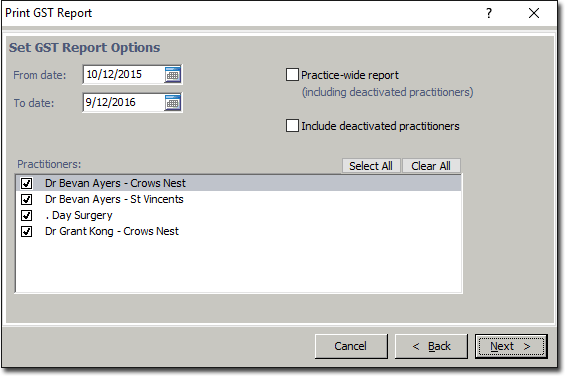 The GST report assists with GST reporting requirements such as the ATO Business Activity Statement (BAS) that is used to periodically report to the ATO on GST collected and paid, and provides a summary of GST collected and earned on an accrued basis and cash basis for a specified period (practice-wide or practitioner-wide).