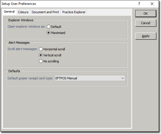Ensure you are logged in to Bluechip as yourself - changes you make to User Preferences are User-specific. To see which user is logged on to Bluechip, check the User Name at the bottom left corner of the Bluechip Main window.