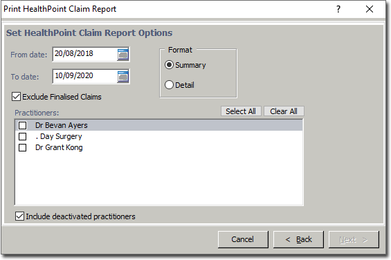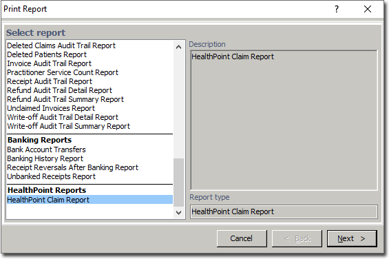 The Print Report windows appear. Select the HealthPoint Claim Report and click Next.