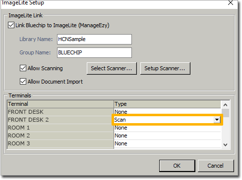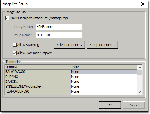 ImageLite Setup For ImageLite Before you begin Procedure Select Setup > Practice > Links > Imaging > ImageLite. The ImageLite > Setup window appears. To Allow Scanning and Document import using ImageLite: Tick the Box: Link Bluechip to Imagelite (ManageEzy). This will now allow you to tick the Allow Scanning and Document Import checkbox. Find the Terminal's name in the list, and change the Type to 'Scan'. Then once you have finished, untick the check box Link Bluechip to Imagelite (ManageEzy) Once complete click OK Results