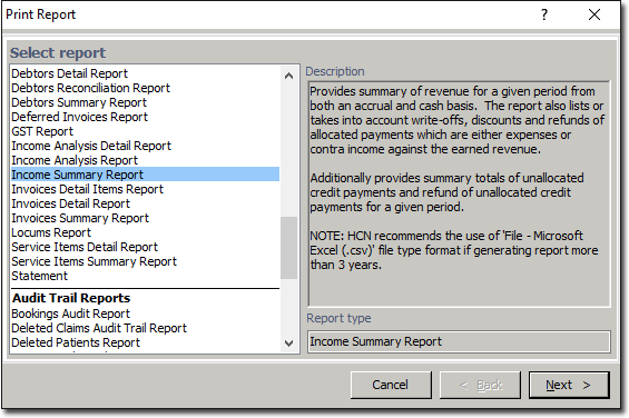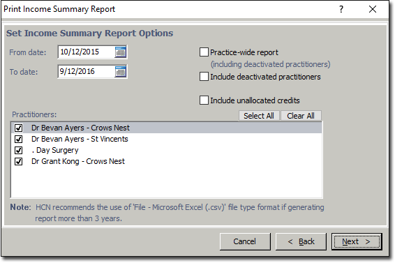 The Income Summary report provides a summary of net earnings, accrued-based and cash-based, for a specified date range (practice-wide or practitioner-wide).