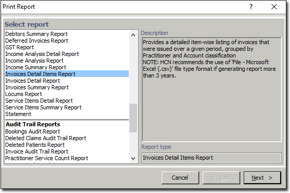 The Invoices Detail Items report is a detailed item-wise listing of invoices that were issued over a given period grouped by Practitioner and Account classification.