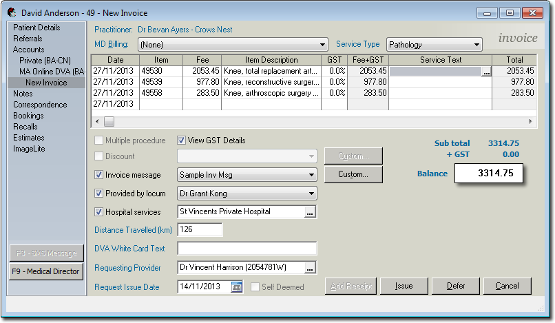 | Distance Travelled (km) | Allows you to enter the distance travelled when preparing an invoice for a DVA claim. Note that this field is not displayed on the image above, as the example patient used is not a Veteran. |