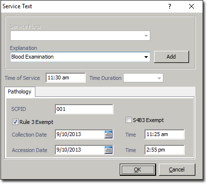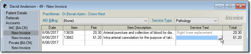 - Optionally, you have recorded customised Service Text Explanations.When recording service items for a pathology invoice, you can record Service Text associated with each Service Item you want to bill. Additionally, you can record a brief explanation to support each Service Text entry. Customised service text explanations can be recorded whenever you create a new invoice. However, it may be more convenient for you to pre-record any frequently-used explanations into a list that you can easily access later, saving you having to manually type the explanation text every time. Customised explanation text can be recorded in advance via the Billing and Fees tab of Bluechip's Practice Options.